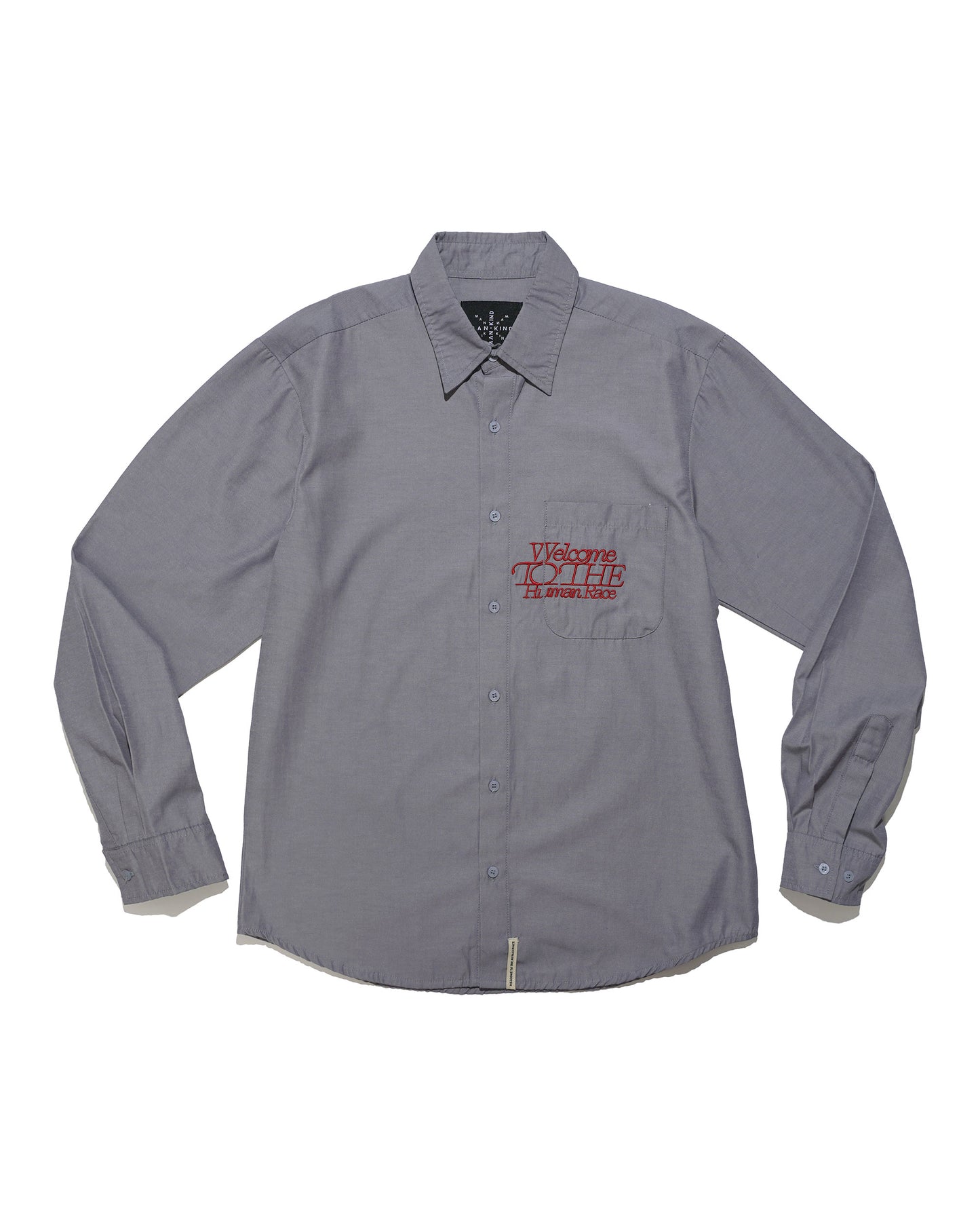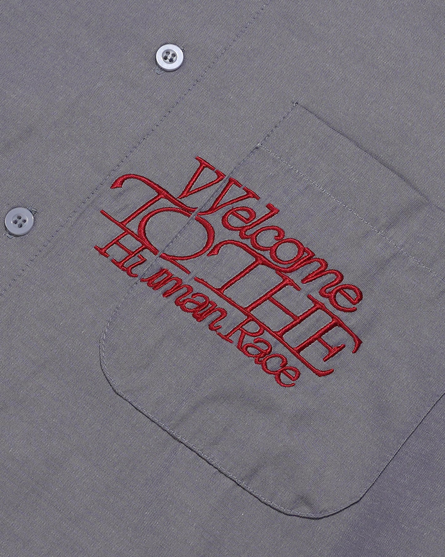 A simple yet striking red embroidery on the front pocket reads "Welcome to the Human Race", adding a bold touch to a clean, minimal design. Subtle details and a timeless silhouette make this piece versatile—wear it casually or layer it up.