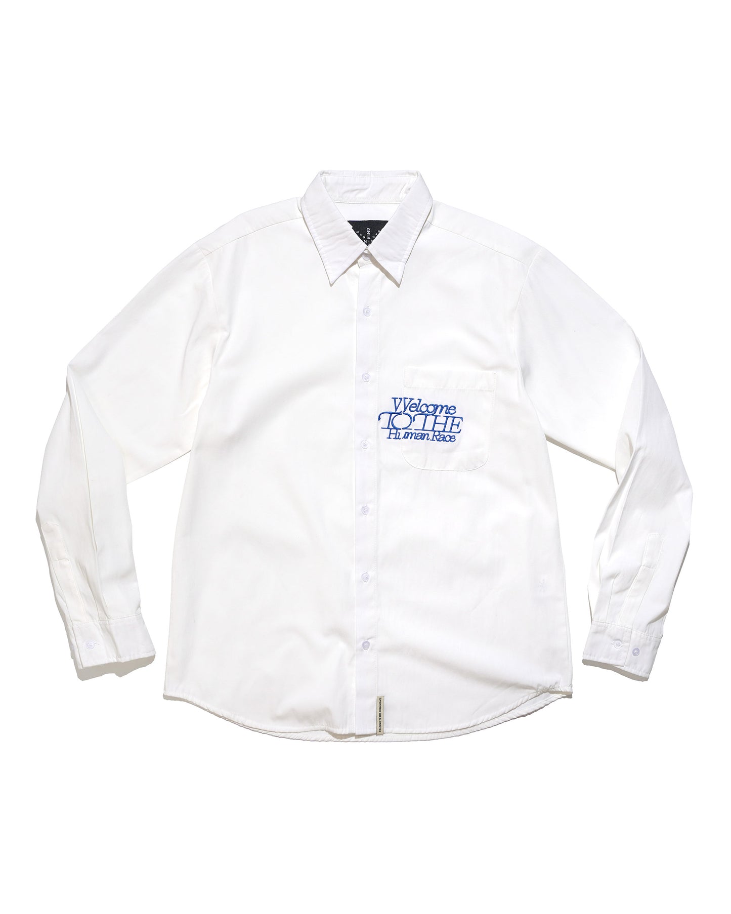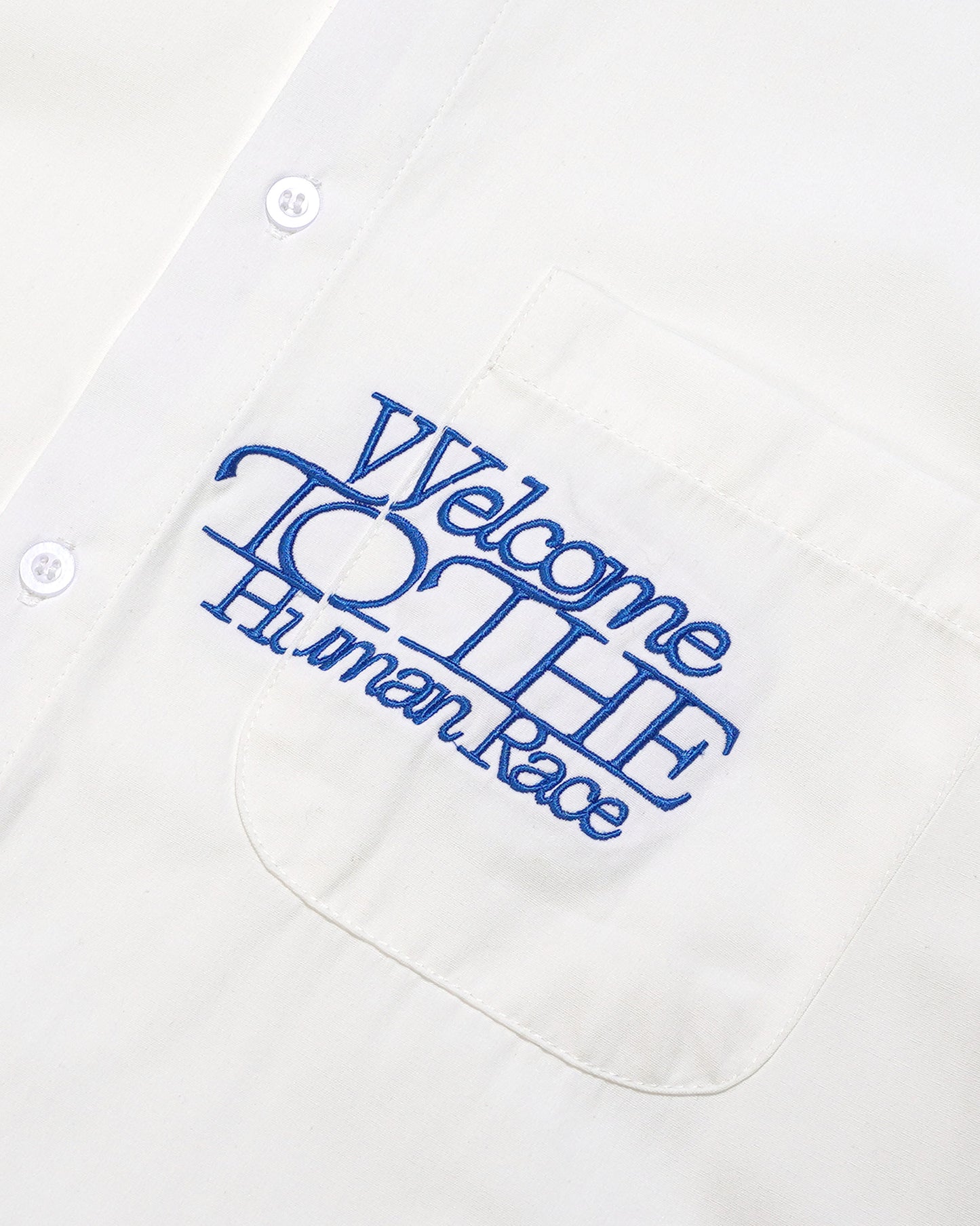 A simple yet striking red embroidery on the front pocket reads "Welcome to the Human Race", adding a bold touch to a clean, minimal design. Subtle details and a timeless silhouette make this piece versatile—wear it casually or layer it up.